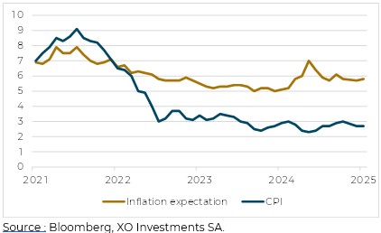 Donald Trump donne ses consignes en ce mois de janvier : baisse du prix du pétrole, baisse des taux américains. Malheureusement ni l’un ni l’autre ne semblent sensibles à ses demandes. Avec le léger redressement de l’inflation (2.9% en décembre), la FED met en pause le cycle de baisse de taux débutée en septembre. J. Powell évoque l’incertitude politique à l’intérieur du pays comme une des raisons de la pause. En cas de hausse des barrières tarifaires imposées au Canada, Mexique et à la Chine, c’est un excès d’inflation compris entre 0.5% et 2% qui pourrait surgir. Du point de vue de la Fed il est donc urgent d’attendre que Donald Trump clarifie l’implémentation de son agenda politique. Et le ralentissement de la croissance des salaires offre un contre-balancier à l’impact des tarifs.